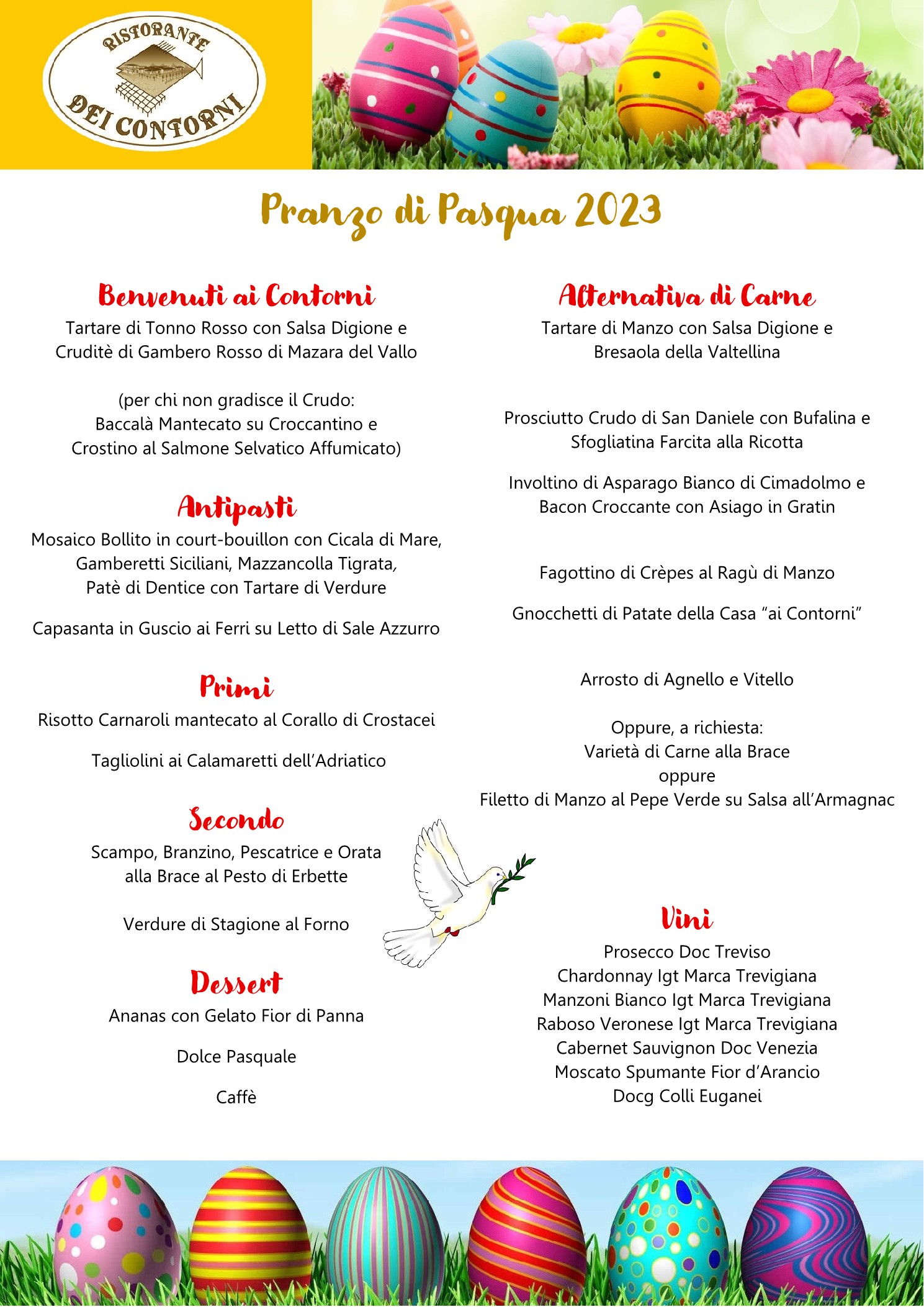 Vi invitiamo giovedì 25 dicembre al tradizionale Pranzo di Natale, per festeggiare con parenti ed amici assaporando le nostre specialità di pesce e di carne. Squisito e ricco menù a base di pesce con alternativa di carne per chi non gradisce mangiare pesce. Prezzi a persona, vini e bevande inclusi: pesce € 95,00; carne € 90,00. Info: 3488004230 (anche whatsapp) oppure 0422798052 oppure info@ristorantedeicontorni.com. Ristorante Dei Contorni – Monastier (TV) via San Pietro Novello 20. .