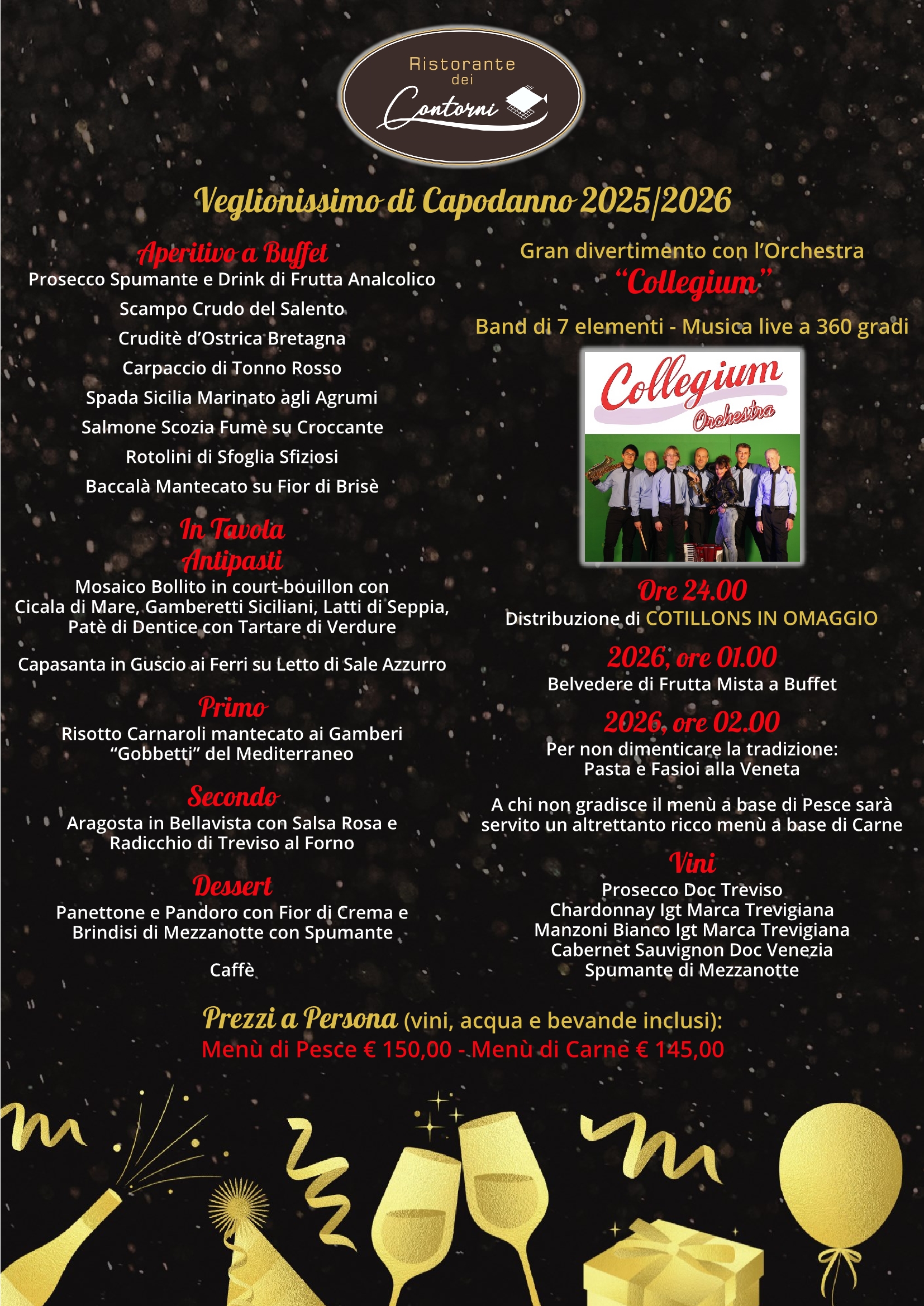 31 dicembre 2025 Per festeggiare nel migliore dei modi l’arrivo del nuovo anno! Maestoso menù a base di PESCE , oppure di CARNE per chi non gradisce pesce. Gran divertimento con le magiche note e la frizzante animazione dell’Orchestra “COLLEGIUM” (band di 7 elementi - musica dal vivo a 360 gradi). Ore 24.00: distribuzione di COTILLONS IN OMAGGIO per tutti! Menù di carne disponibile su richiesta via mail o whatsapp. Prezzi a persona, vini e bevande inclusi: pesce € 150,00; carne € 145,00. Info: 3488004230 (anche whatsapp) oppure 0422798052 oppure info@ristorantedeicontorni.com. Ristorante Dei Contorni – Monastier (TV) via San Pietro Novello 20. .